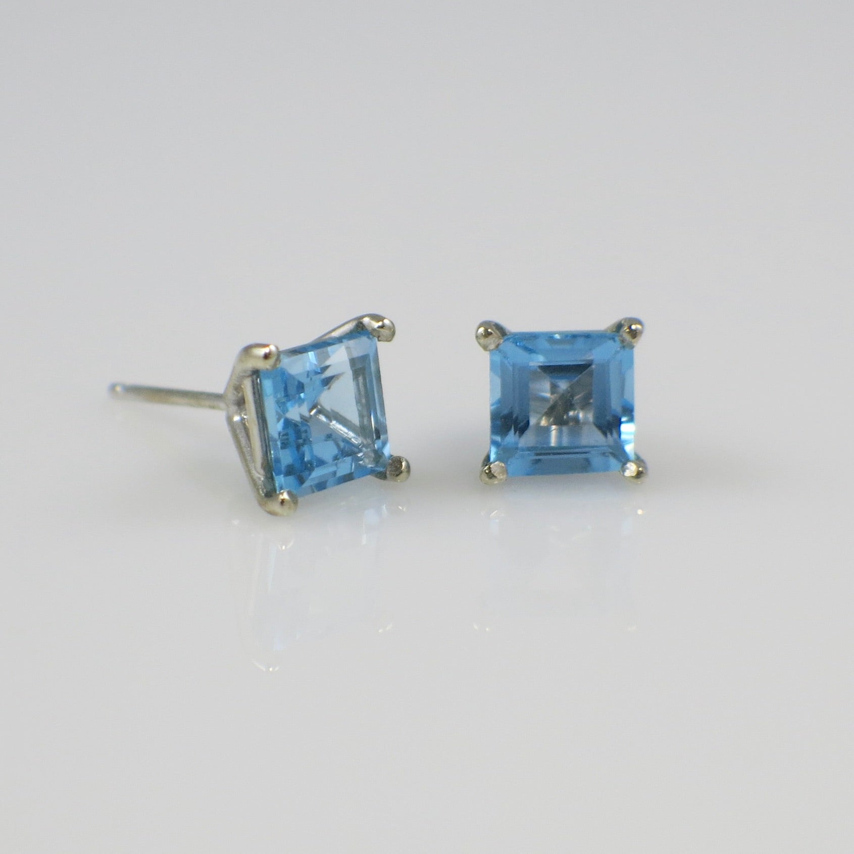 Radiant and refined, these 14K white gold stud earrings feature vivid 6mm square step cut Swiss blue topaz gemstones. The precise step cut emphasizes the clarity and rich blue color of each stone, offering a sophisticated, mirror-like brilliance that captures the light beautifully.