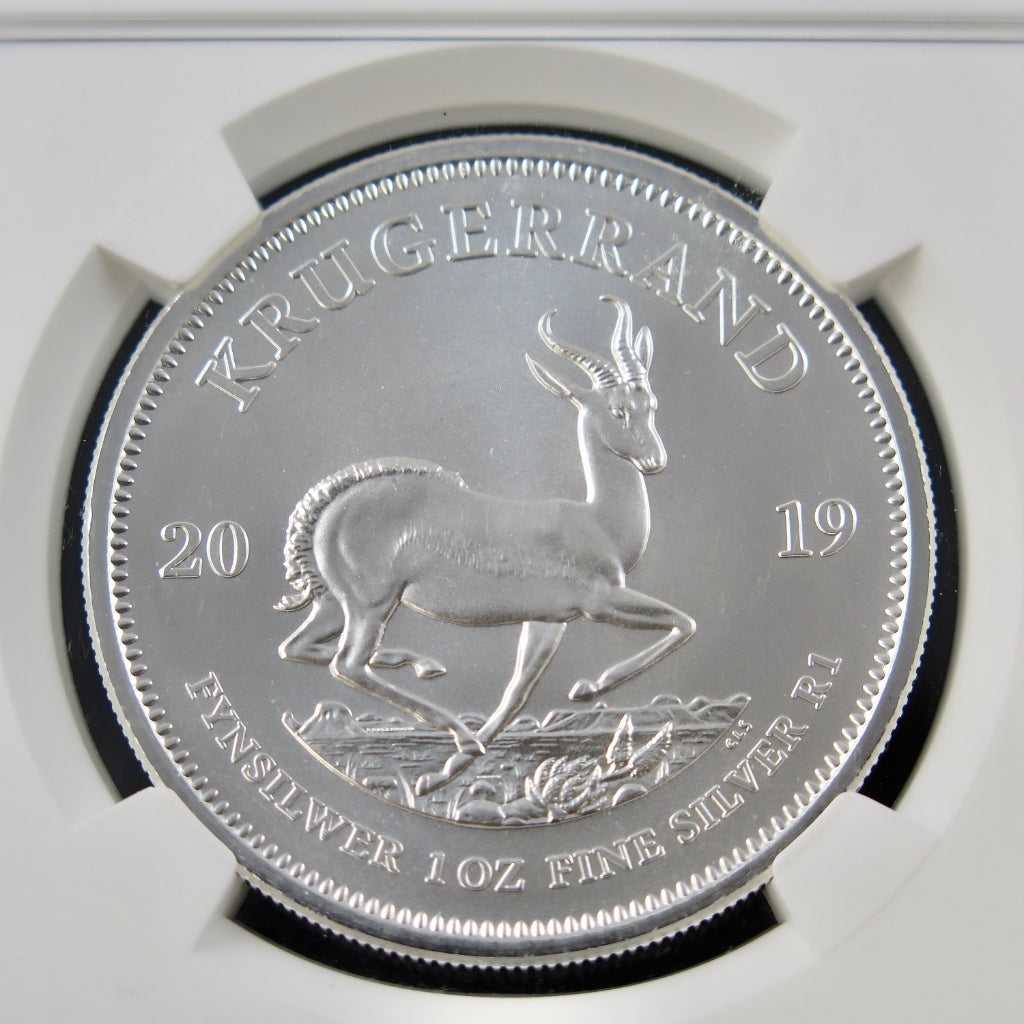 The Krugerrand is one of the most recognizable and historically important bullion coins in the world. First issued in gold in 1967 to promote South African bullion, it paved the way for global investment coinage. The silver version debuted in 2017 and has since gained international acclaim for its quality and enduring design. The 2019 issue continues this tradition, combining the historic artistry of Otto Schultz’s Kruger portrait with Coert Steynberg’s elegant Springbok reverse, struck in brilliant .999 silver and certified by NGC for quality assurance.