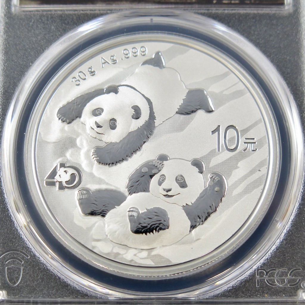 The 2022 China 10 Yuan Silver Panda, certified by PCGS as MS70, marks the 40th Anniversary of the world-famous Panda series. Struck in 30 grams of .999 fine silver, this release features an elegant design of two young pandas at play. This example carries the coveted First Day of Issue designation and an exclusive signature label hand-signed by Cheng Chao, one of the official Panda designers. With a population of only 50 coins graded in MS70 with both FDOI and an authentic Cheng Chao signature, this is an elite modern Chinese silver collectible.