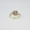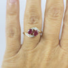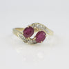 This stunning 14K yellow gold bypass ring features two vivid oval-cut natural rubies accented by shimmering natural diamonds. The elegant bypass design symbolizes unity and connection, while the contrast of deep red rubies and bright white diamonds creates a timeless and romantic look. Measuring 9.5MM at the widest point and weighing 2.8 grams, this ring is perfect as a statement piece, anniversary gift, or July birthstone treasure.