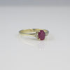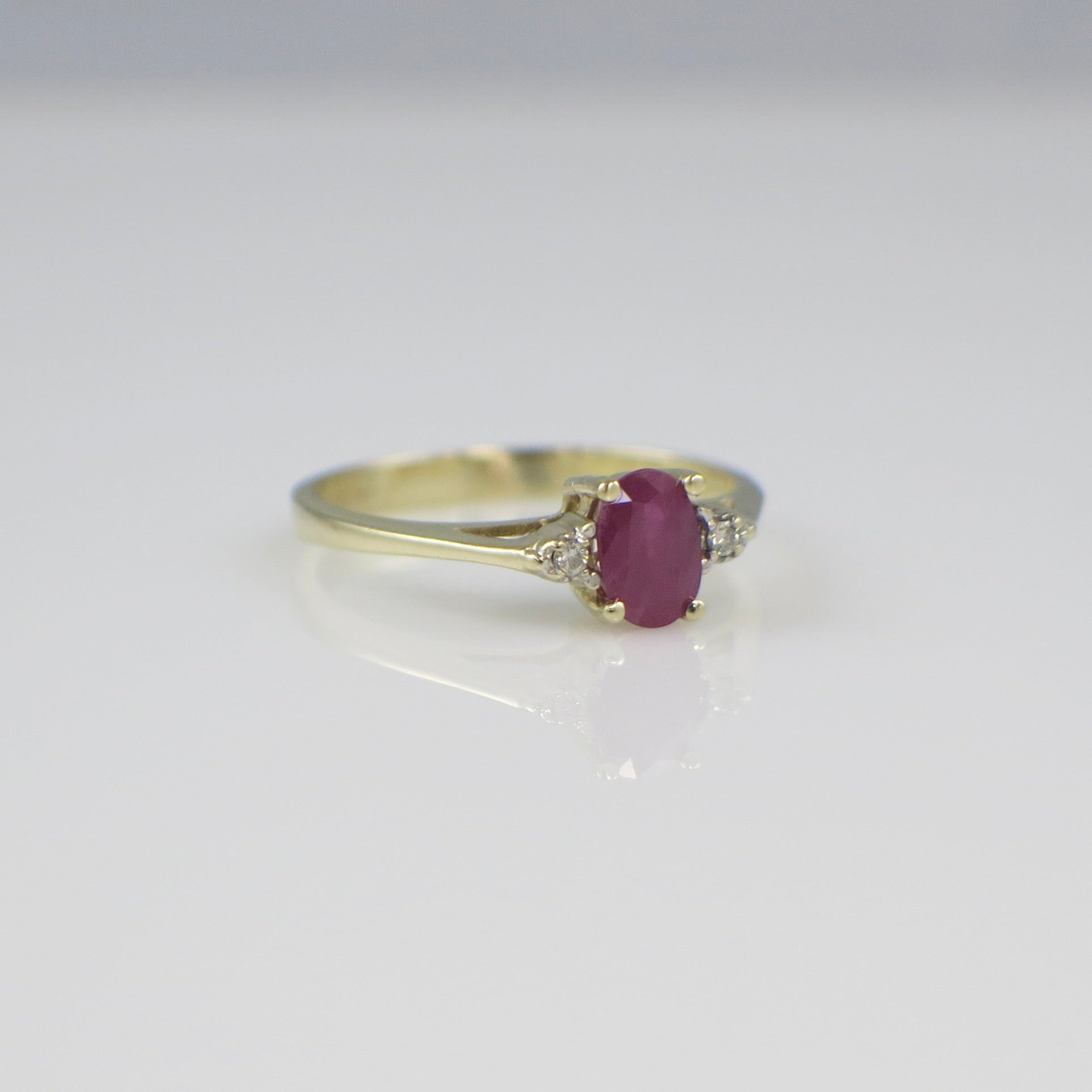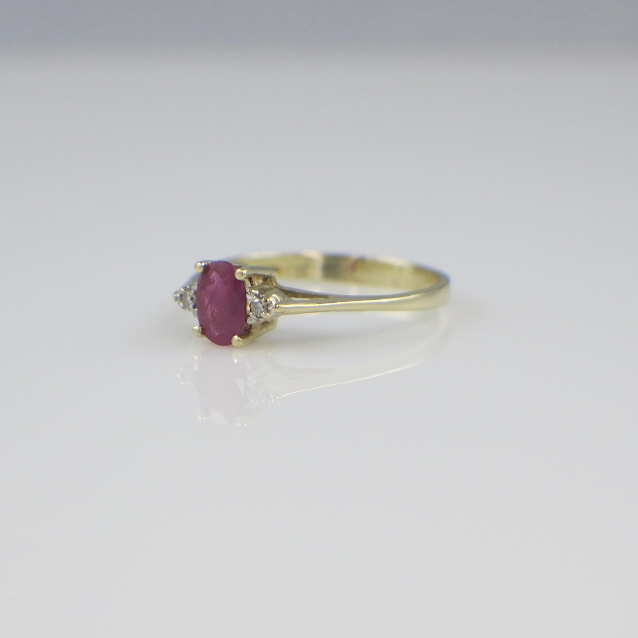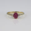 A beautiful vintage ruby and diamond ring crafted in solid 14K yellow gold. This elegant three-stone design showcases an oval-cut ruby at the center, flanked by two sparkling round diamonds. The ring’s refined proportions and warm gold tone evoke classic mid-century craftsmanship, making it both timeless and versatile.