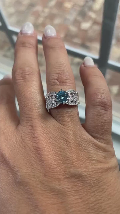 10K White Gold Blue Glass & Diamond Ring | Vintage-Inspired Scroll Design Size 7