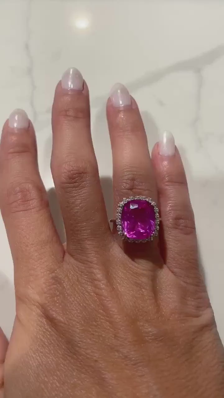 This striking ring showcases a bold 14 x 12 mm cushion-cut synthetic pink sapphire, framed by a sparkling halo of natural diamonds. Crafted in 10K white gold, the design enhances the sapphire’s vibrant color while creating a look that is both bold and feminine.