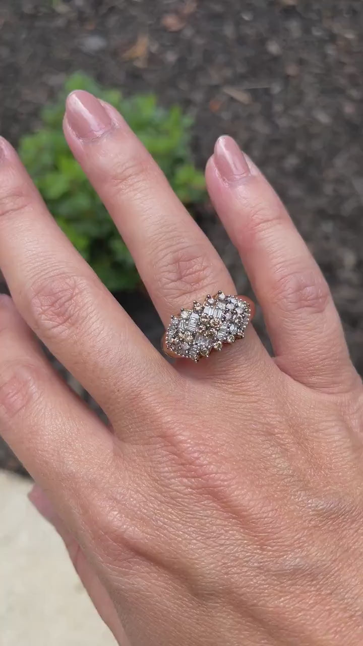 This stunning 10K yellow gold cluster ring features a captivating blend of rich champagne round brilliant diamonds and sparkling white diamond baguettes. The intricate arrangement creates a dimensional, radiant display that spans across the top of the finger, offering eye-catching brilliance from every angle.