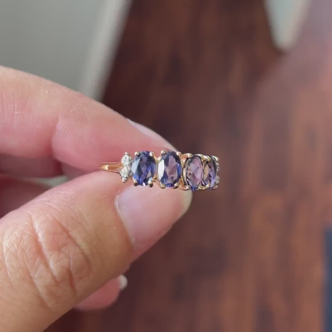 10K Yellow Gold Tanzanite and Diamond Ring – Four Oval Stones, Size 6.75