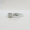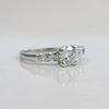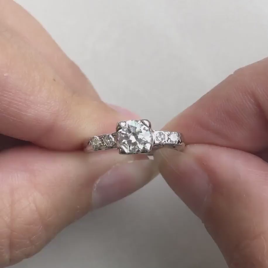This delicate vintage engagement ring features a .51 carat round brilliant center diamond, set securely in new prongs for added durability and longevity. Accenting the center are two single cut diamonds on each side, adding sparkle and charm to this classic white gold setting. A perfect choice for those seeking a timeless, vintage-inspired engagement ring.