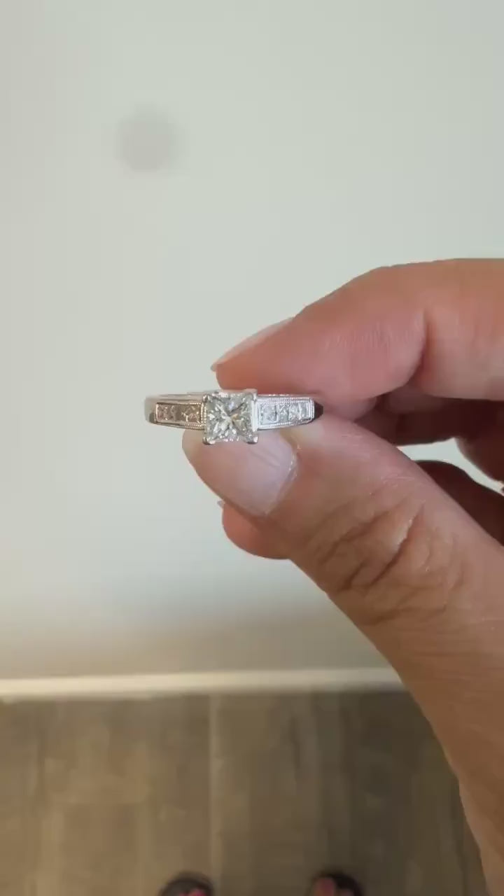 Center Stone: 0.55 CTW Princess Cut, SI2–I1 Clarity, F–G Color
