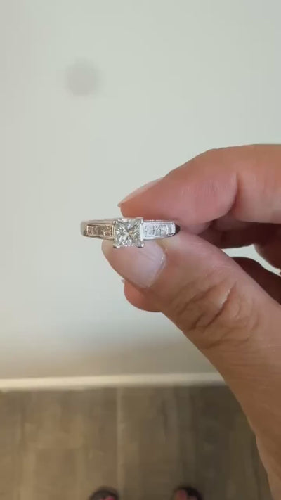 This elegant engagement ring features a dazzling 0.55 carat princess cut center diamond set in luminous 14K white gold. Additional princess cut accent diamonds cascade down each side of the band, bringing the total diamond weight to 0.75 carats.