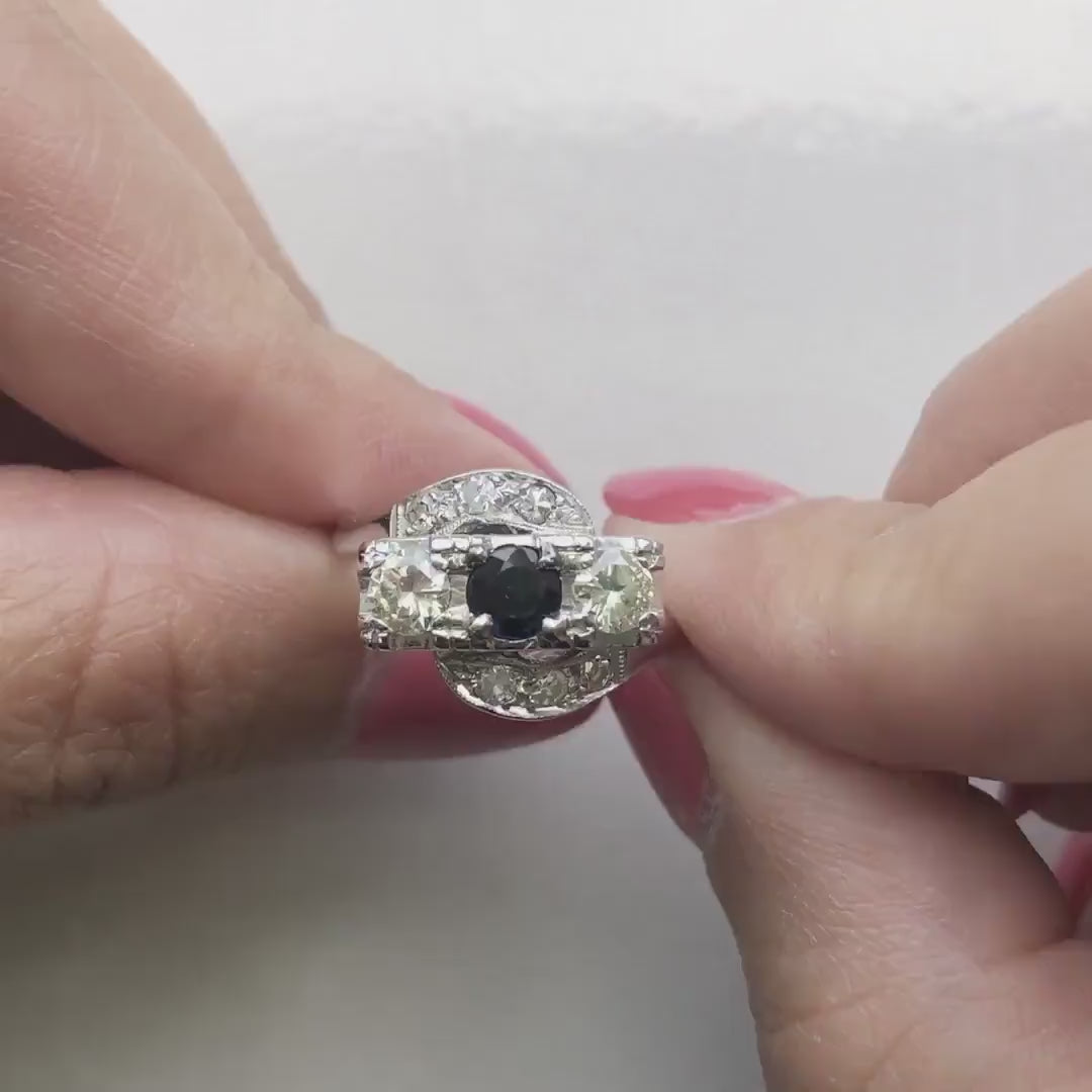 14K White Gold Sapphire and Diamond Art Deco Ring – Milgrain Detail, Size 5.75