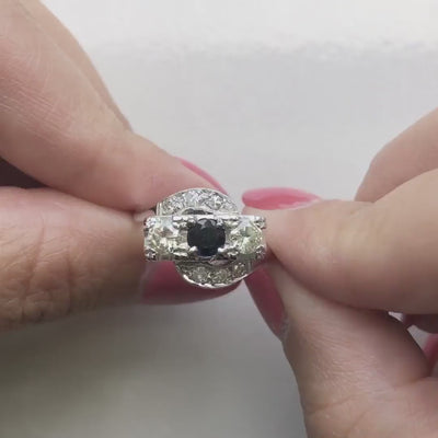 This exquisite Art Deco-inspired ring features a .40 CTW deep blue round sapphire as the centerpiece, accented by two warm-toned round brilliant diamonds and additional single-cut diamonds scattered across the head for added sparkle. Crafted in 14K white gold, the design is finished with intricate milgrain detailing that enhances its vintage charm. A stunning choice for an alternative engagement ring, a meaningful heirloom piece, or a standout right-hand ring, this piece is perfect for lovers of fine vintage jewelry.