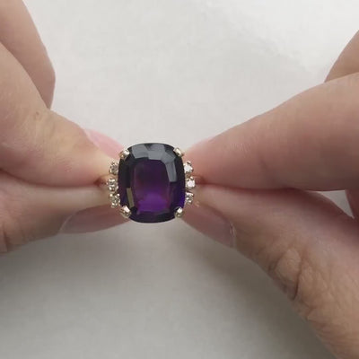 14K Yellow Gold Cushion Cut Amethyst & Diamond Cocktail Ring | Size 5.25