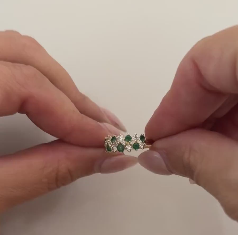 This elegant 14K yellow gold band features seven vivid green natural emeralds and thirteen brilliant white natural diamonds in a unique tiered cluster design. The arrangement sets six of the diamonds slightly between the others, adding sparkle, texture, and depth for a truly eye-catching look. Perfect as a stacking ring, a May birthstone gift, or a stand-alone statement piece, this vintage-inspired band offers both beauty and versatility.