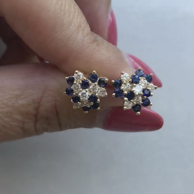 14K Yellow Gold Sapphire & Diamond Cluster Earrings | Vintage Floral Studs with Threaded Backs