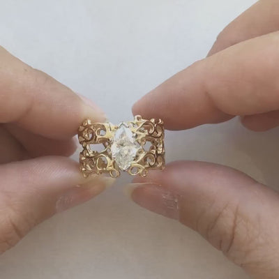 This bold and artistic 18K yellow gold ring features a wide, handmade scrollwork band that wraps around the finger with an airy, lacy elegance. At its center is a striking 1.00 carat marquise-cut diamond, set in 18K white gold with a secure V-prong head.