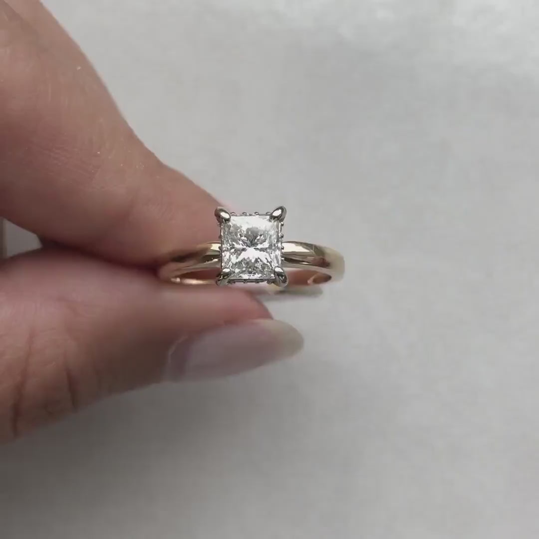 A subtle row of accent diamonds enhances the white gold head, while the sleek 2 mm yellow gold shank provides a modern contrast to this classic solitaire style. Perfect for those who love a blend of traditional elegance and contemporary design.