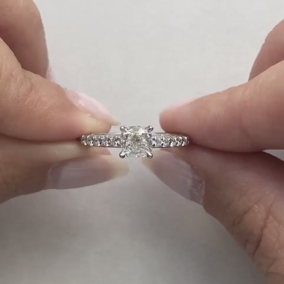 This platinum engagement ring features a bright and beautiful 1.01 carat cushion cut diamond, certified by the GIA for quality and authenticity. The SI1 clarity and G color center diamond is prong-set and flanked by six shared-prong round brilliant diamonds on each side of the band, adding even more sparkle to this timeless design.