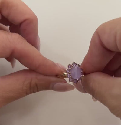 This breathtaking floral-inspired ring features a soft lavender jade cabochon as the centerpiece, surrounded by ten lavender-purple sapphires arranged like delicate petals. The 14K yellow gold setting enhances the unique color palette, creating a perfect blend of elegance and artistic design. Ideal as a statement ring, a meaningful gift, or a one-of-a-kind addition to a vintage-inspired jewelry collection.