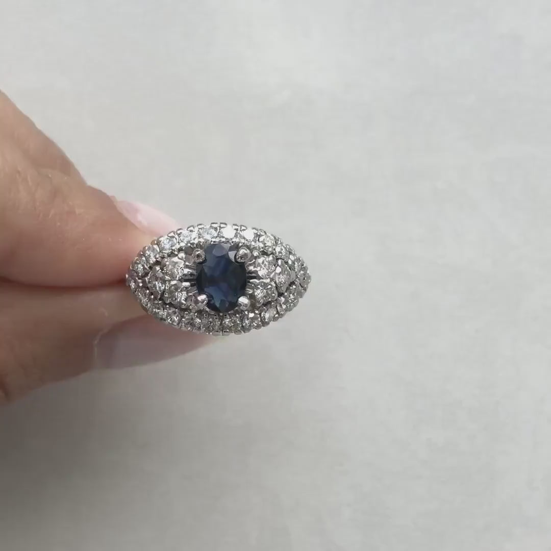 Platinum Oval Sapphire & Diamond Evil Eye Cluster Ring – Vintage, Size 6.5