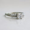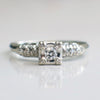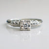 This vintage 14K white gold engagement ring features a timeless design with a distinctive square head setting that beautifully frames the round brilliant center stone. Ornate corner details secure the diamond while adding structure and elegance, giving this ring a refined, vintage appeal.