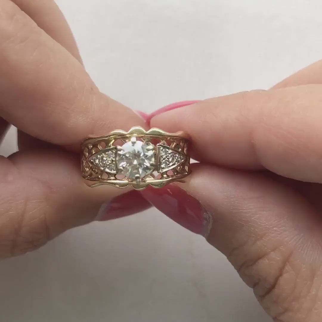 This remarkable vintage engagement ring features a 0.66 carat round brilliant diamond set at the center of an ornate 14K yellow gold lattice-style band. Two triangular sections accented with single-cut diamonds flank the center stone, adding extra sparkle and vintage texture.