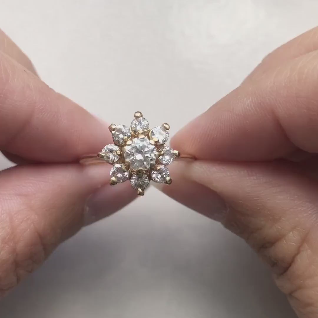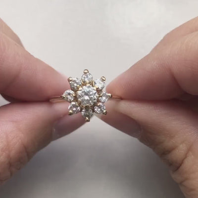 Vintage 14K Yellow Gold Diamond Flower Cluster Ring | Round Brilliant 1.02 CTW Size 7.5