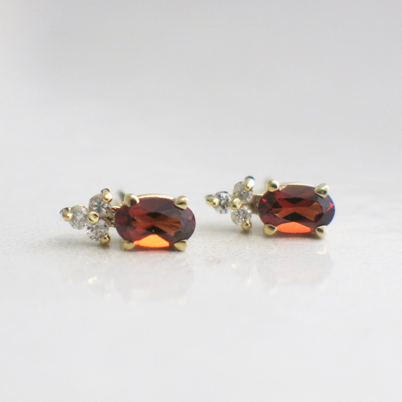 These vintage 14K yellow gold stud earrings feature the timeless combination of deep red garnets and sparkling white diamonds. Each earring showcases an oval-cut garnet accented by three round-cut diamonds, creating a look that is both elegant and versatile.