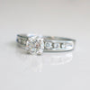 This vintage platinum engagement ring features a dazzling 0.76 carat round brilliant center diamond, accented by six channel-set round diamonds for a total weight of 1.06 carats. The platinum band gently tapers from 3.55 mm to 1.89 mm, giving the ring a refined silhouette while ensuring durability for everyday wear.