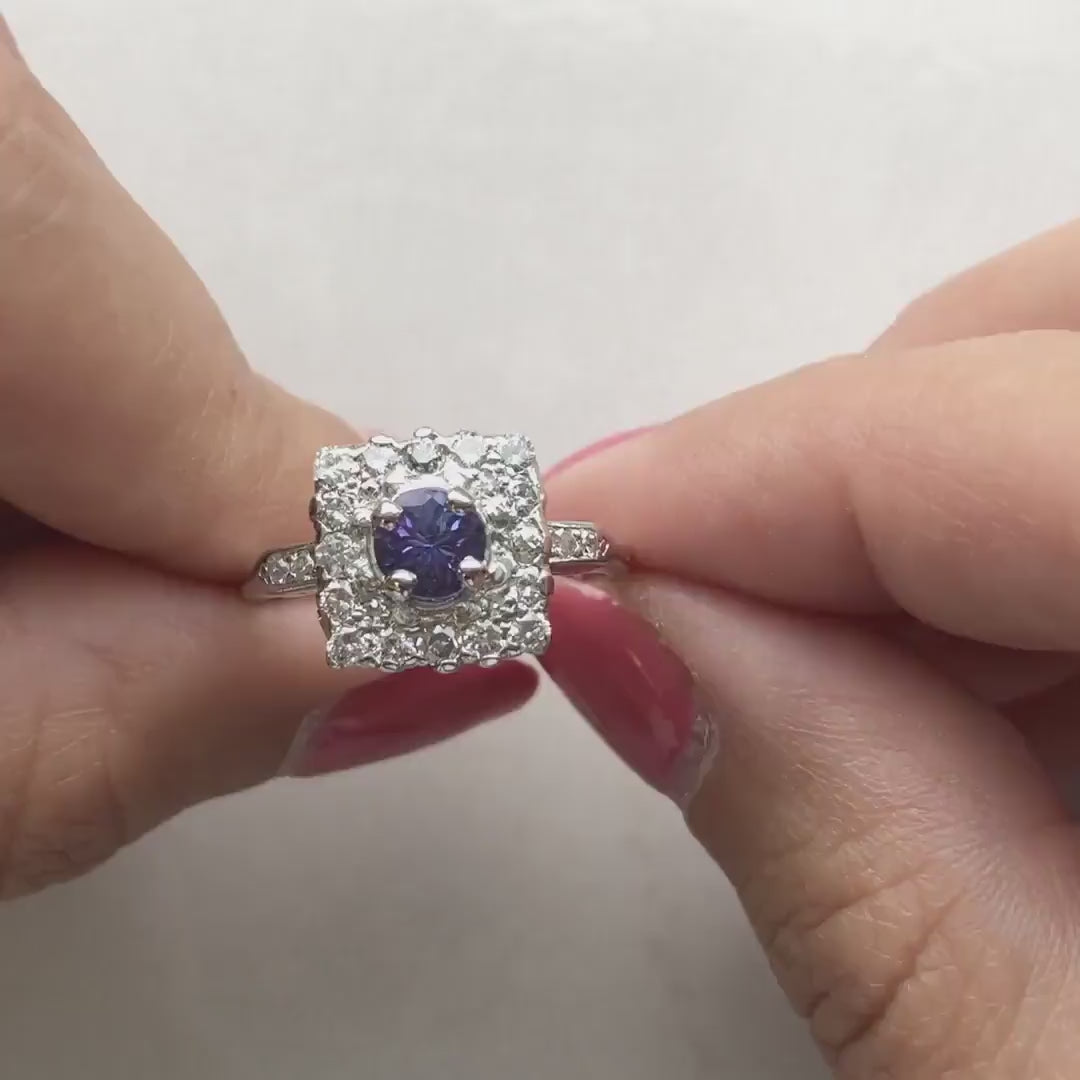 Vintage Platinum Tanzanite & Diamond Halo Ring – Square Cluster, .56 CTW Diamonds, Size 6.75