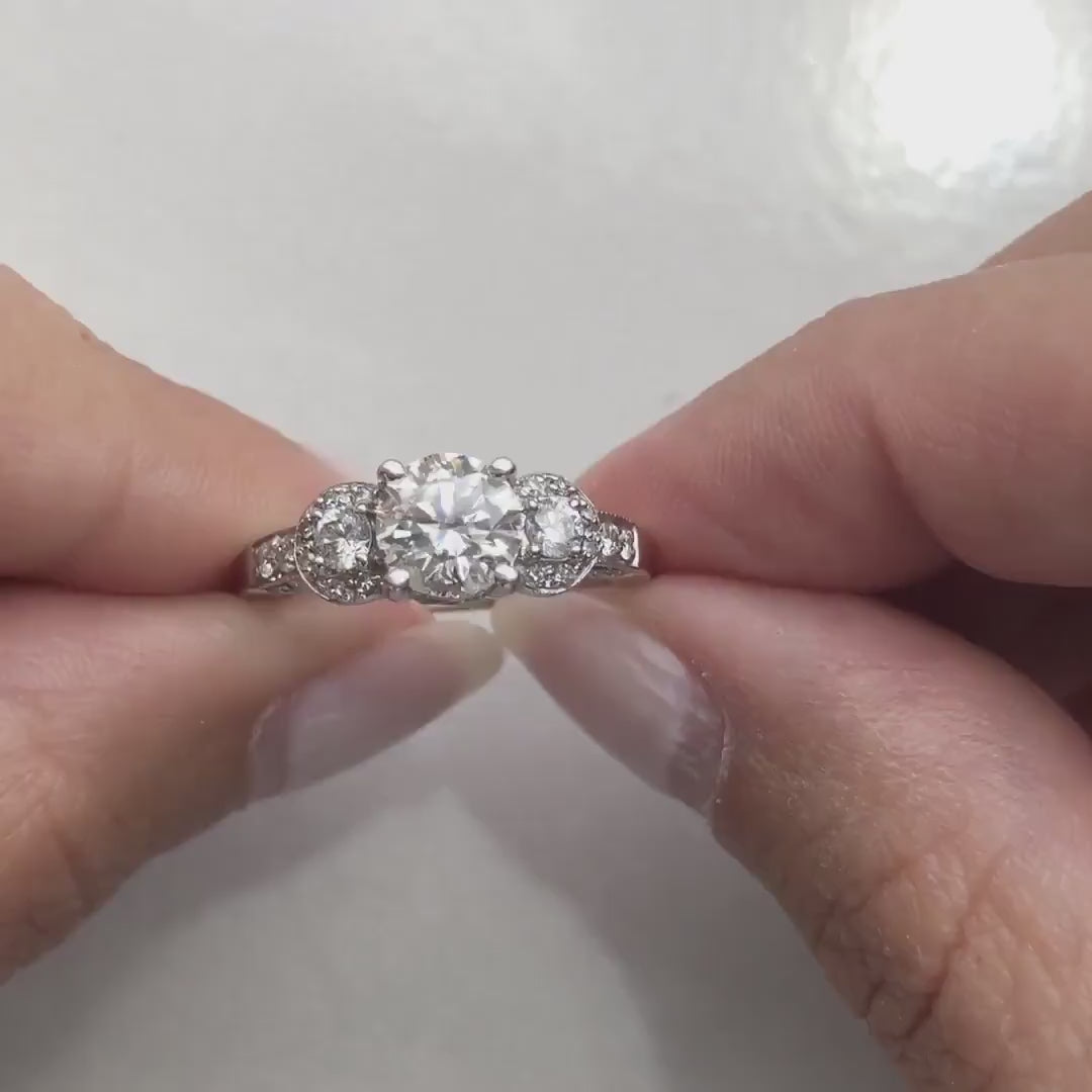 This vintage-inspired engagement ring showcases a brilliant 1.10 carat round center diamond, accented by two side stones set within delicate diamond halos. Additional diamonds trail down the shank and extend into the side profile, ensuring sparkle from every angle.